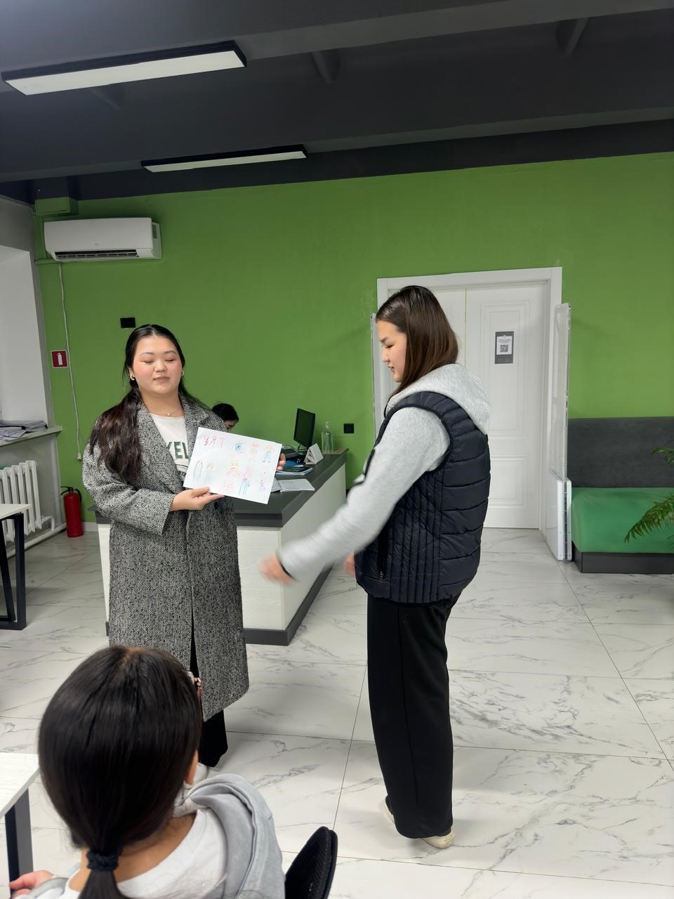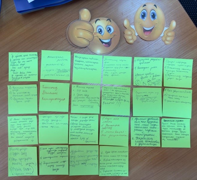 1. «Танысайық» рөлдік ойыны – қатысушылар өздерінің кәсіби таңдауы мен қызығушылықтары туралы әңгімеледі. Бұл үшін есімді бейнелеу және топтық жаттығулар сияқты стандартты емес әдістер қолданылды, олар топты біріктіруге ықпал етті.