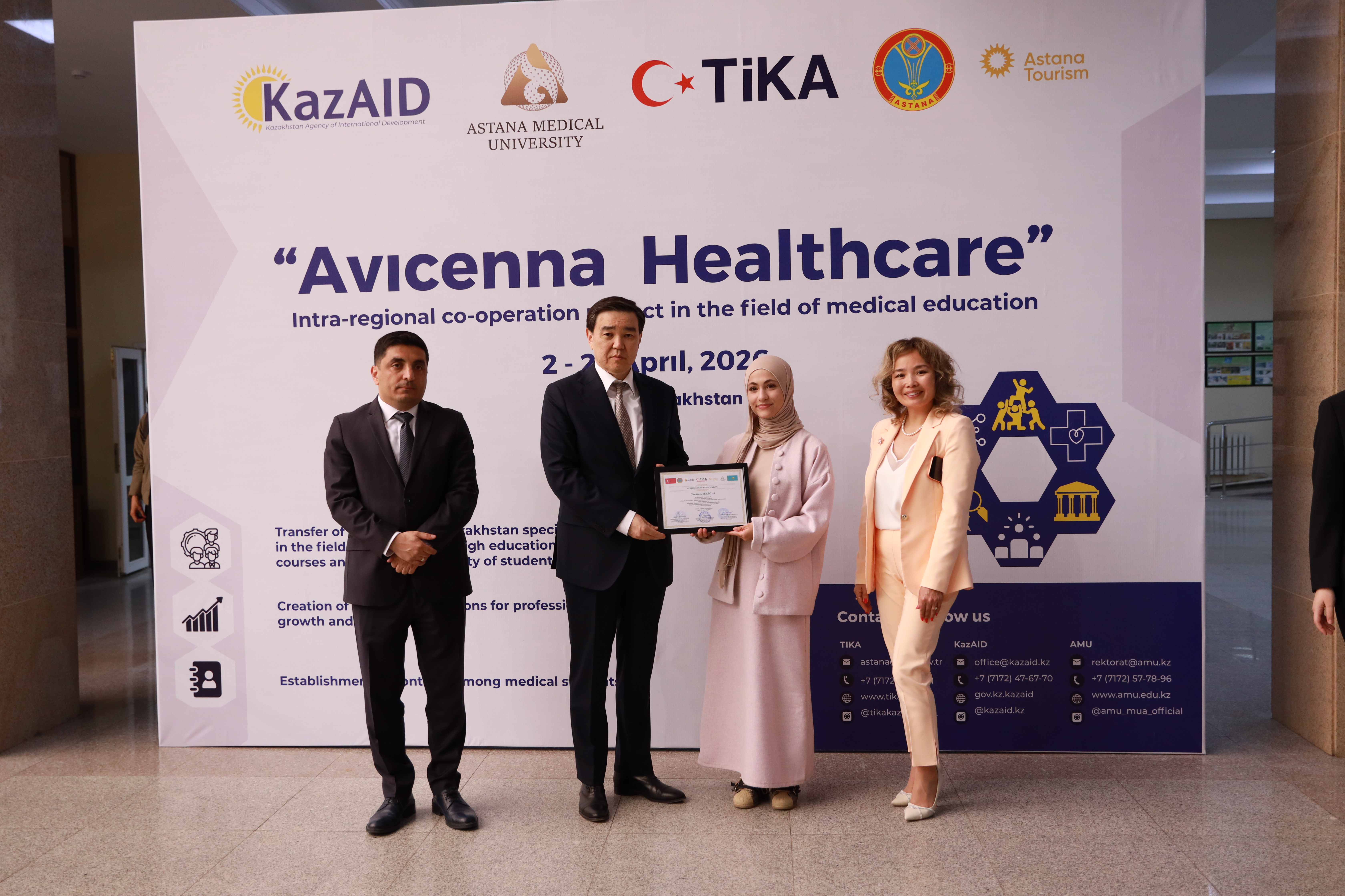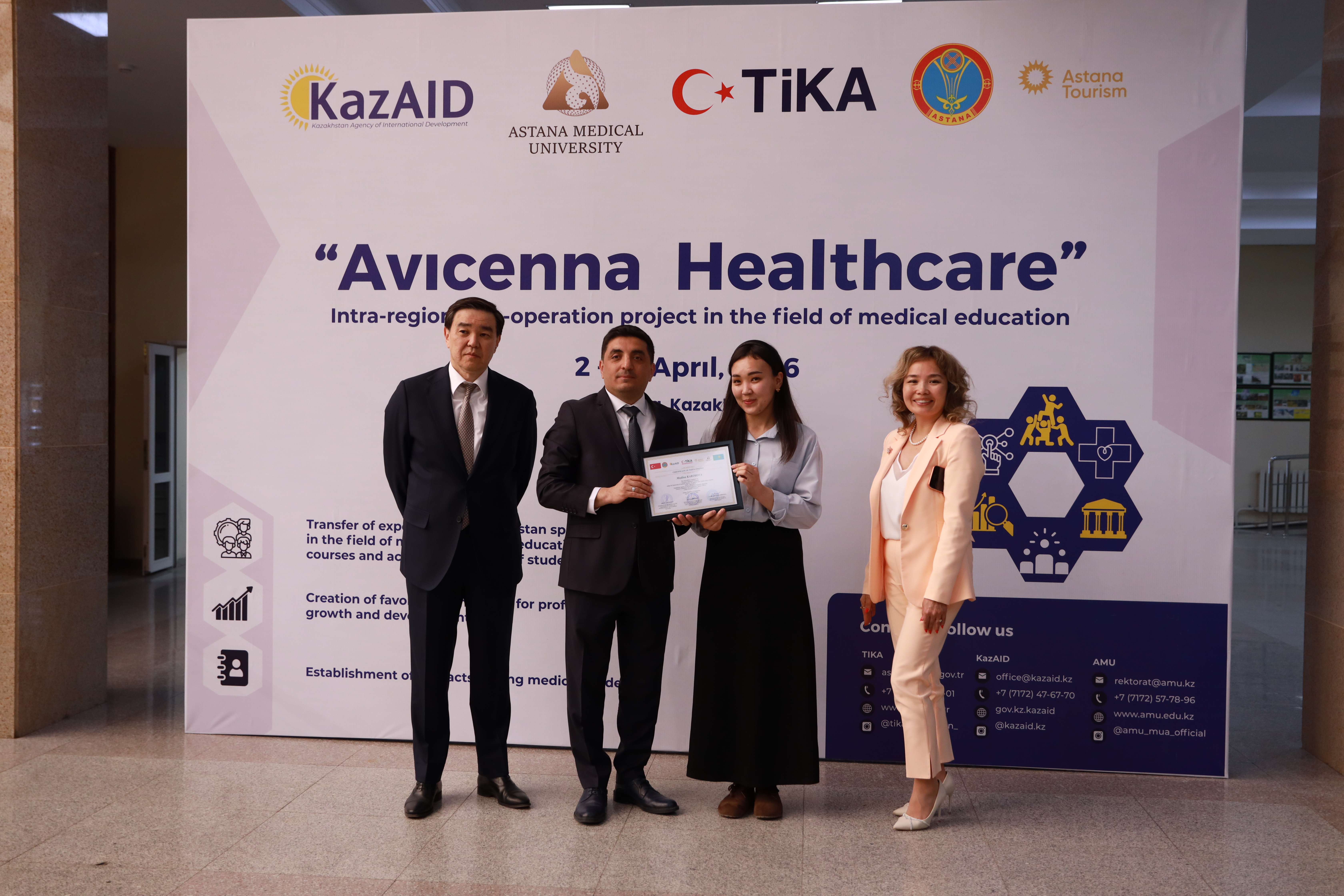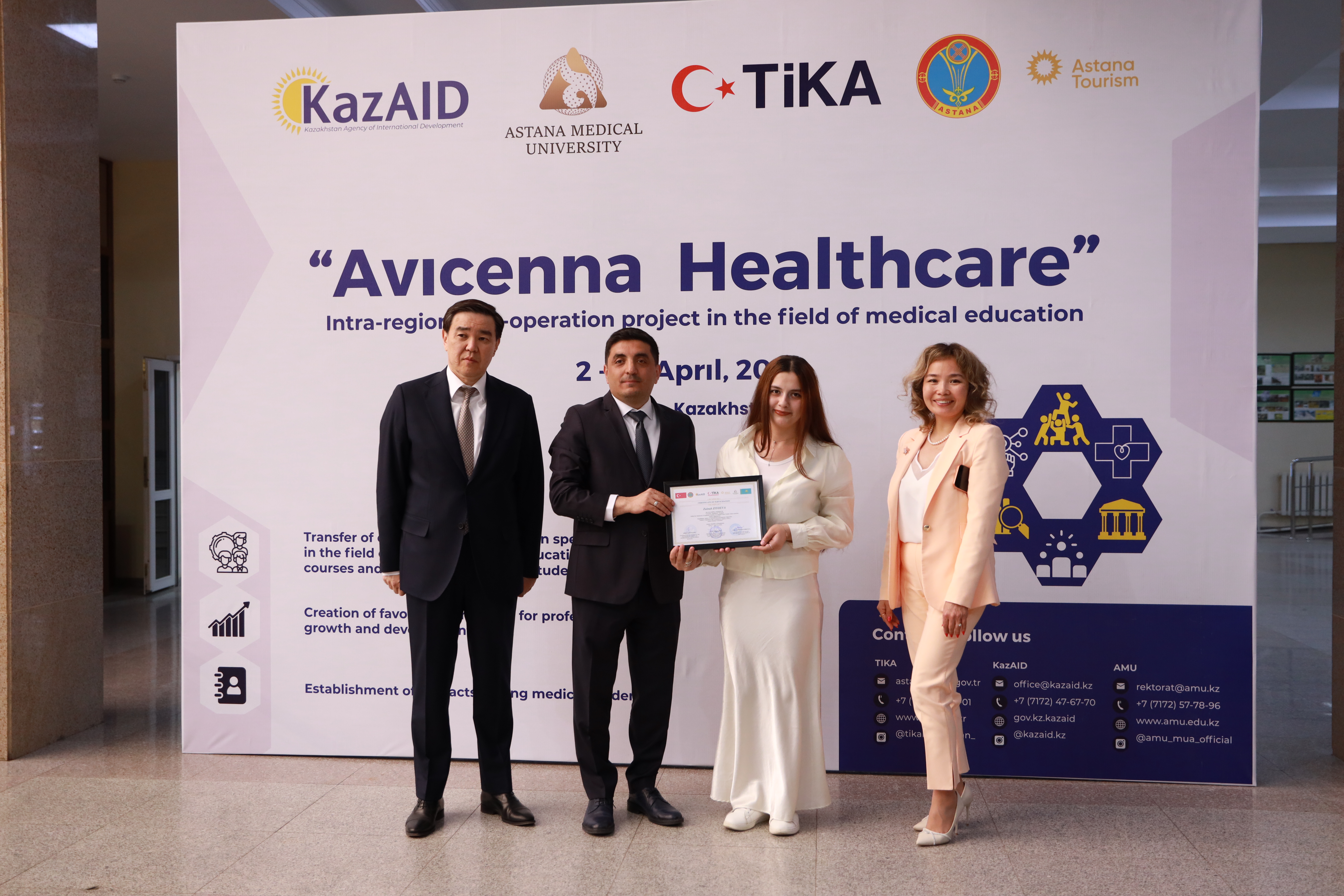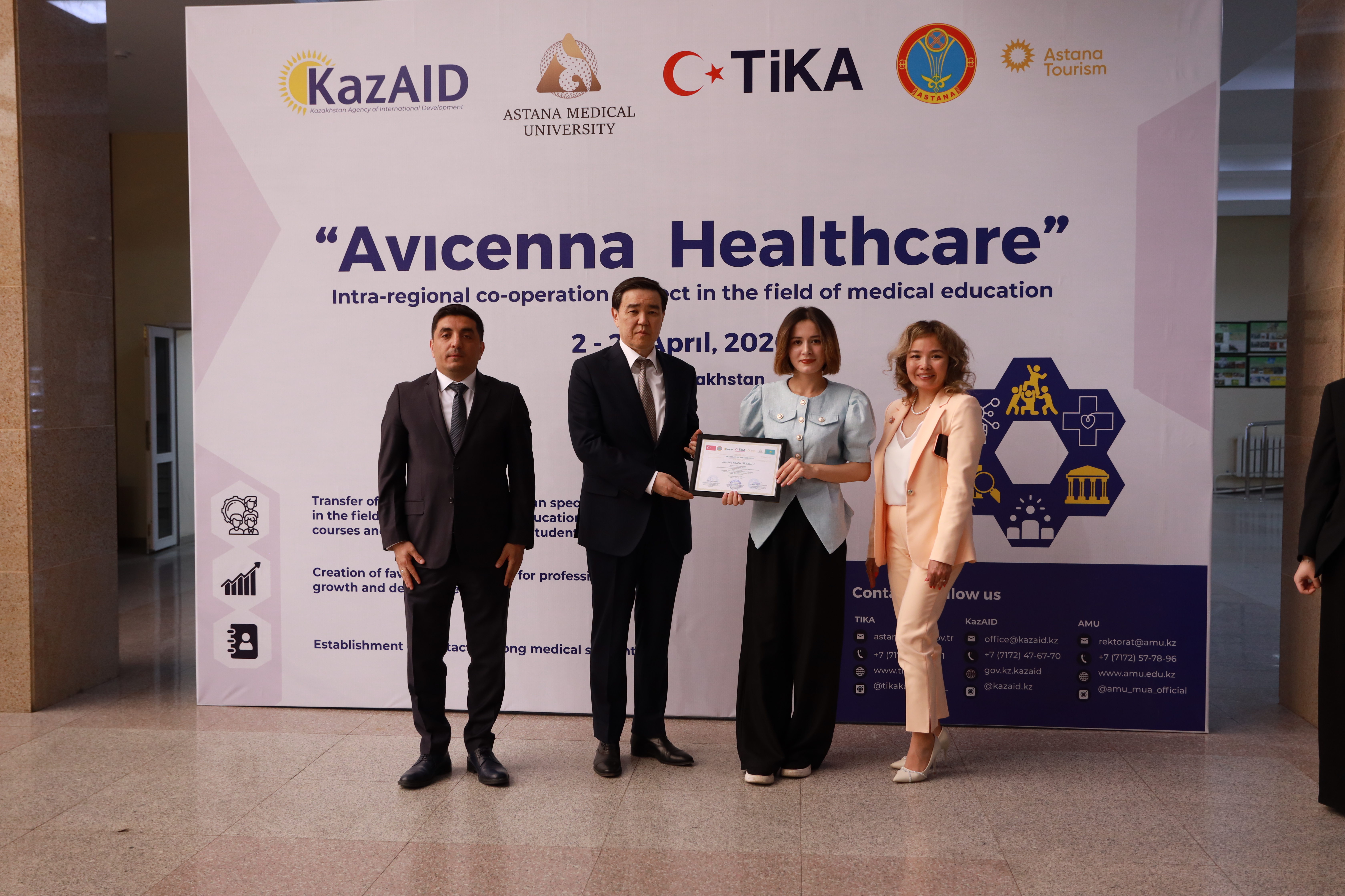Астана медицина университетінде Қазақстанның халықаралық даму агенттігі KazAID және Түркия ынтымақтастық және үйлестіру агенттігі TIKA қолдауымен жүзеге асқан «Avicenna: Healthcare» халықаралық білім беру бағдарламасының жабылу салтанаты өтті.