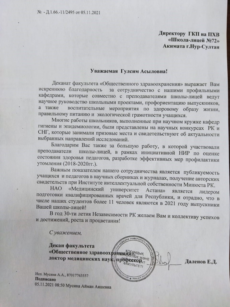 Деканом факультета «Общественного здоровья и менеджмента» профессором Даленовым Е.Д. было направлено благодарственное письмо на имя директора школы-лицея №72 Жусуповой Г.А. за активное сотрудничество, и участие школьников на научных конференциях МУА, участие преподавателей лицея проектах инициативных НИР по оценке состояния здоровья педагогов и разработке эффективных мер профилактики.
